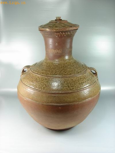 敞口,长颈,鼓腹,平底。附一盖,顶有一纽,盖沿斜外饰弦纹。肩部塑有对称衔环兽面双耳。颈部划百弦纹和水波纹。肩部饰弦纹和百鸟纹。施青釉,颈部和下腹部不施釉。