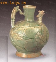 这是一件五代时期黄堡窑址出土的减地刻花凤首青瓷壶。黄堡窑是耀州窑的前身,宋代黄堡窑属耀州治,故宋以后称耀州窑。耀州窑精美的青釉刻花瓷器举世闻名。减地刻花是先刻出纹样轮廓,再将花纹以外部分沿轮廓线向外剔掉一部分,使纹样凸现,并以不同的层次表现花瓣或枝叶等,类似于浅浮雕的样式,富有立体感。刻好后再在细部划出类似叶筋、花蕊等线条,让纹样更细腻生动。