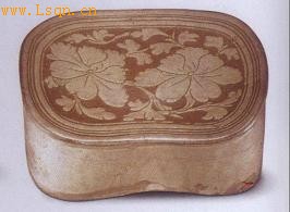 高13.4厘米,长30.6厘米,宽22.2厘米。 这件宋代定窑剔花牡丹纹枕高13.4厘米,长30.6厘米,宽22.2厘米。枕面椭圆形,中部稍凹,出檐,直壁,平底,底部有两出气孔。枕面剔白色化妆土成牡丹纹,牡丹花姿态优美,构图精练,划饰花蕊、花叶及边框。胎质较粗,白中闪黄,釉莹润而色泛灰黄,有密集、透明的冰裂纹,底露胎。