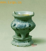 高10厘米、口径6.7厘米、底径6.8厘米。 该器平唇,直沿。口沿上饰对称双系,束颈,鼓腹,腹下饰三足,足与平座相连。座呈六方形,座中部内收,底部内凹。炉的颈部用青料绘变形回纹一周。腹部饰折枝菊花纹两组。座中部内收处又绘变形回纹一周。青花呈色浓艳青翠,料浓处有深色铁锈斑。施青白釉,底部无釉。