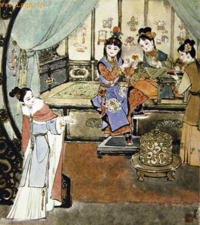 这是《红楼梦》第二十一回里的情节,这一回的回目是“贤袭人娇嗔箴宝玉,俏平儿软语救贾琏”。前半回写袭人和宝玉的冲突,当中夹写了一笔宝钗对袭人的暗赏。古本里这个地方有条脂砚斋批语,意思是这一回是从两个丫头来表现两对主子的关系,到了后来——指的是八十回后——有一回回目是“薛宝钗借词含讽谏,王熙凤知命强英雄”,那回文字里,就不是通过袭人、平儿来折射二宝和琏凤的关系了,是直接去表现那两对人物的意识冲撞。