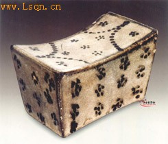 高10.5厘米、长14厘米、宽8.5厘米。 枕为马鞍形。枕的一端有一圆形小气孔,枕的五个面均饰不规则形的褐彩,施青白袖不及底且闪黄绿色,造型规整古朴、瓷枕是我国古代的夏令寝具,无论富贵、贫贱都极喜好。瓷枕始于隋,流行于唐、宋、元、明四代,产地众多,形制纷繁。