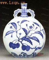 高26.6公分。 瓶口小,细颈,扁腹,肩对称饰如意云耳。器型、纹饰与青色乃摸拟永宣青花,惟妙惟肖,庶几乱真,唯署“大清雍正年制”款,知其为“官仿官”之珍品。主题纹饰寓意吉祥,果实累累的荔枝,谐音“利吉”。