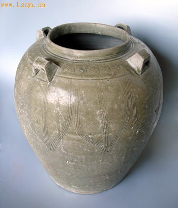 直口,口微敛,短颈,溜肩,深腹,腹上部鼓,腹下部渐收至底。肩附四桥形方系,系间刻弦纹和水波纹。腹部刻倒置莲瓣纹一周。