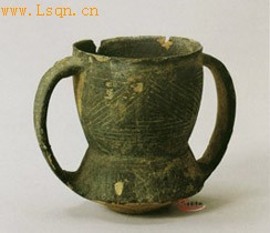 高10.5厘米、口径9.1厘米、底径4厘米。 黄褐陶。口微敞,高领、内折、凹腰、扁腹、平底。门与腹间有双对称大耳。口内壁与腹表绘黑彩绸绕与菱形纹,颈表绘黑彩重叠三角纹,耳面绘平行线与斜线纹。造型奇特,装饰美观。