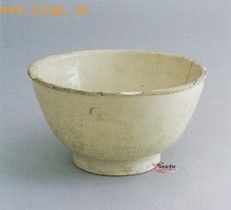 通高12.5厘米、口径11.5厘米、圈足高2.3厘米、圈足壁厚0.6厘米。 碗口沿卷唇,唇部饰五个对称削口,俯视呈小丙花形,深腹,高圈足,釉色浓厚,白釉中闪黄,底部与足跟无釉,器物壁较厚,内底有三个支烧疤痕,形制之大,实属罕见。 谤据器物的造型和烧制特点及同墓出土的铜镜,该器物为五代巩县窑的产品。