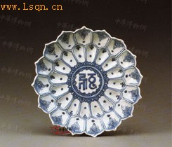 直径19.2cm。 “大明万历年制”六字二行楷书款,万历本朝。盘形犹如一朵盛开的双层莲花,般内壁如花瓣状下凹,内绘双钩垂云纹,盘心平坦,在两周如意云纹内书梵文;外壁在上层莲瓣内,以花卉间隔梵文装饰,为万历朝较为特殊的典型品种之一。口沿冲、崩。