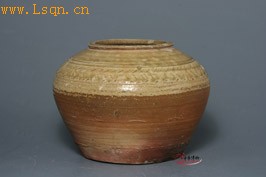 高13cm、口径10cm、底径12.3cm。 此瓿造型朴拙稳重,整体工艺粗中有细,釉水青中泛黄,较为润泽,肩部的线条和点状弦纹简单自然又不乏变化,下腹部及底部胎骨中溢出的火石红浓重自然,是开门的汉代青釉制品。