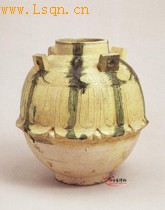 高22厘米、口径6.8厘米、底径9.5厘米。 此罐直口,腹圆鼓,平底实足。肩附四方系,系下刻卷莲纹一周,腹部堆刻覆莲瓣纹。南北朝时佛教盛行,莲瓣成为当时的主要装饰题材,与造型巧妙结合,既增加了造型美感,又发挥了装饰效果。自肩到腹部施半截淡黄釉,并饰六条绿色彩条,彩条色彩鲜艳,开了斑驳灿烂的唐三彩之先河。