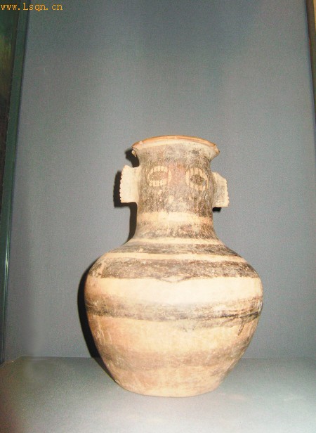 藏品名称:马家窑马厂时期人面双耳彩陶壶