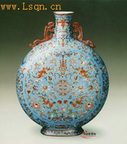 高28.5厘米、口径5厘米、足径10—7厘米。 瓶撇口,短颈,竖向扁圆腹、椭圆形圈足。颈、肩之间对称置螭耳。瓶内施松石绿釉,口沿涂金彩。外松石绿地粉彩装饰,通体绘有蝠、“寿”字、磬、蝶及缠枝花纹样。底足内施松石绿釉,署金彩“大清嘉庆年制”六字篆书款。 “蝶”谐音“耋”,古时指七八十岁年纪,寓意长寿。此瓶的中心图案绘五蝠环绕“寿”字和蝴蝶,寓“五福庆寿”。