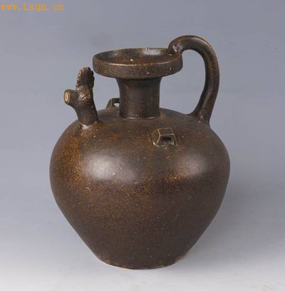盘口,细颈,圆鼓腹,平底。肩部塑一鸡头,肩部另一侧与口部间塑一曲柄,肩部两侧饰对称桥形系,釉面光洁,品相完整。