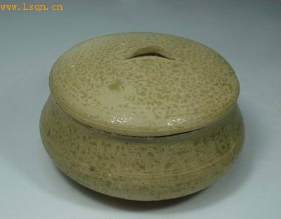 原始青瓷。敛口平沿,扁圆形浅腹,平底。带盖,盖面微凸,盖面中心塑有一系。内外施青釉,底部不施釉。造型美观,典雅别致。