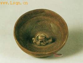 高4.2厘米、口径11.2厘米、底径3厘米。 该碗施褐釉,深灰色胎,环底。碗内下腹部施有弦纹两道,弦纹下至碗底用深褐色彩,点画成水波纹加以装饰。碗内底堆塑一只鱼鹰,用脚爪站在一尾鲤鱼身上,鲤鱼张嘴翘尾,鱼鹰侧首凝视,造型生动,自然质朴。