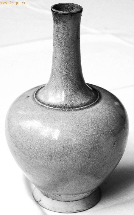 这件宝贝高20多厘米,釉色白中泛青,大肚细颈,颈部修长,整个看起来非常规整而又饱满舒适。釉光温润,开片