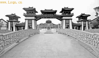 淹城正门是一座飞檐翘角的“淹城阙”。进去,见一古色古香的双鸟龙三轮青铜盘,传说为淹君宴请宾客用的餐具,按1∶10比例放大而成,真品则是淹城出土的一级文物,收藏在国家博物馆。