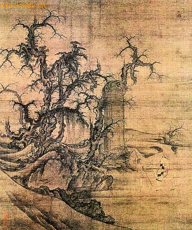 喜欢李营丘,就是从《读碑窠石图》开始的,这幅画,画面并不繁复,但意境深邃,带给观者无限的想象。你看吧,一位旅人骑在驴背上,一位侍者侍立在侧,俱是一副疲惫不堪的样子,似乎已经走了很远的路。在一座风蚀斑驳的高大石碑前,他停下来,仰头看碑,细细研读碑文记载的历史。石碑的周围,野生着几株苍劲的古树,这些树木,已经在岁月里掉光了所有的叶子,只用钢针铁锥一样的枝桠,无言地弹响风霜。树下的窠石圆浑起伏,杂生的荆棘乱草一派萧疏之气——