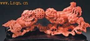 “千年珊瑚万年红”,珊瑚是海中的瑞宝,自古深得世人钟爱。红珊瑚因其生长慢、寿命长、质坚色妍、产量稀少而身价不菲,其中体型巨硕者难觅,最为珍贵。本品长36cm,形体恢弘而色彩鲜妍夺目,质地温润,纹理佳美,殊为难得。得巧匠为之执刀,精雕双狮戏球图。所雕雌雄二狮置身飘带之上,双爪抱绣球,欲作翻腾状,形象生动可爱,其面目清晰传神,长鬃飘逸流畅,绣球雕琢精致,内有可转动宝珠,尚有幼狮三只,憨态可掬,散见雌狮周围。雕刻水平非凡,将材质之形态与装饰之题材结合完美,利用极致。
