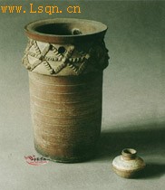 高21.4厘米、口径13厘米、底径10.6厘米、罐高3.9厘米、口径2.1厘米、底径3.2厘米。 直口,平折沿,斜直肩,筒腹,平底。圈部有对称圆孔四个,并堆塑一条扁圆形中心绳纹,另有由上下两条绳纹交错呈波浪式的连续纹带,在两条绳纹的交接处贴饰乳钉。腹部饰凹弦纹六道。吊水罐为直口,溜肩,鼓腹,平底。肩部有黄釉,多脱落。此器及吊水罐当是一组供殉葬用的明器。