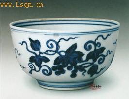 高6.7厘米、口径12.6厘米、足径6厘米。 碗直口,深腹,圈足,足内白釉无款。造型敦厚古拙。里外以青花为筛。里心绘葡萄纹一枝,外腹绘折枝葡萄三组。 此碗釉面白中泛青,青花淡雅柔和,是典型的国产青料所致。纹饰描画精工,布局得当,是弘治青花的上品。