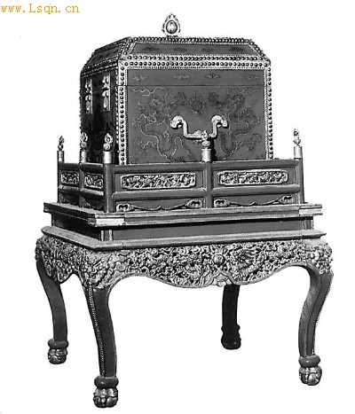 御宝平时都装在宝盝内,一宝一盝。盝就是匣子,宝盝一般包括盛宝大箱、小箱、箱架、印池及其它附属物,都有一定的规格。盛宝大箱的规格是高一尺三寸,方一尺二寸,木质朱漆,彩画红黄金云龙,黄绫糊里。盛宝小箱高九寸,方八寸五分,金质,镌香草花纹。小箱内还有纯素金质的印池,印池内还有宝袱、宝褥、宝袋、宝垫等,都用黄色的绸缎制作。箱架高二尺一寸,方一尺八寸,楠木制作,雕刻龙纹,朱漆,贴金饰,用金饰件装订。