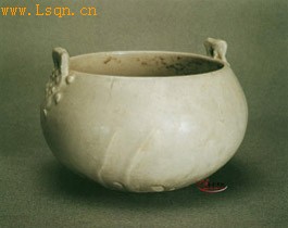高9.5厘米、口径11.7厘米。 形似钵,口沿有对称的双系。在系与罐体粘接处有数十个乳钉纹装饰,有摹仿金属工艺的效果。瓷胎略灰,内外施白釉,外壁近底处无釉。釉层凝厚,腹部有缩釉现象,釉凝聚处呈青绿色。与河北省曲阳县涧磁村定窑遗址出土标本相似,应属晚唐河北定窑所烧造。