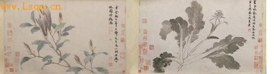 第一段:本幅无款,右下钤印“启南”(朱文)。另有吴宽题诗:“半含成木笔,本号是辛夷。一树石庭下,故园增我思。”钤印“延州来季子后”(朱文)。另钤“项元汴印”(朱文)等鉴藏印多方。此幅采用没骨法绘折枝辛夷,以苍秀古拙之笔画花卉枝干,以不同水分的色墨画出花瓣叶片,色泽浓淡分明,层次丰富,再用重墨劲细之笔勾画叶筋。构图疏密有致,设色清妍秀雅,富于蕴蓄之致。
