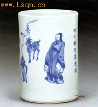 明崇祯 青花人物故事诗文笔筒