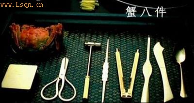 当然不像话。这哪像有钱有闲的贵族们干的事儿啊。于是有个叫漕书的人,发明了“蟹八件”,它们分别有垫、敲、劈、叉、剪、夹、剔、盛等多种功能,简称为“蟹八件”。后来至民国初年,发展到鼎盛时期最多的一套吃蟹工具竟多达六十四件(见陆文夫《美食家》)。