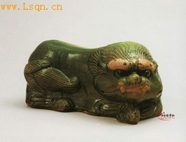 高13厘米、宝28.2厘米、长16厘米。 卧狮形,狮尾回卷贴身,胎土细而坚,呈深灰白色;全身施深绿釉,眉及唇部盖有化妆土并施透明釉,黑眼圆睁,双唇紧闭,底平坦,有擦去绿釉后的痕迹,通气孔被巧妙地布置在狮子的嘴角边。