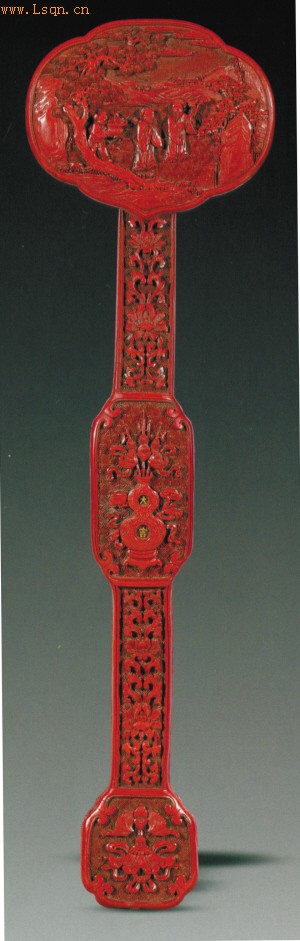 此件如意采用雕漆技法制作而成,头部描绘两个老人在松石掩映的水岸边交谈,左边老人身后的童子怀里抱着满满一篮子灵芝,右边老人一手持灵芝形拐杖,另一手指向画面右侧,似乎在告诉左边的老人,那里更好的灵芝可供采摘。如意身中部开光内雕饰一件大吉葫芦瓶,瓶内插三柄方天画戟,戟上趴着一只蝙蝠,瓶周围放置寿桃和灵芝,整幅画面寓意吉庆长寿、福禄万代。尾部开光内雕蝙蝠衔宝伞,下拴黄线双回头穗。如意背面通体雕饰万字不到头形式的锦纹。刀法快利,精细纤巧,人物生动传神,采用菱花形地锦,这些都是乾隆朝苏州织造成做雕漆器的显著特点。