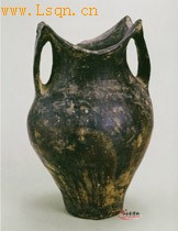 砂质红陶。马鞍形口、长颈、深腹略鼓、平底:口与肩之间有两个对称的双耳,器表涂有一层细泥陶衣。