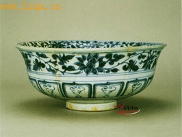高12厘米、口径29厘米、足径10厘米。 撇口,浅腹,小圈足。属元代典型器型。内外绘青花纹饰,内心单圈绕内绘莲池鸳鸯纹,池中莲荷盛开,两只鸳鸯相对游弋,画面清新,笔绘自然流畅。内口沿绘缠枝栀子花一周。外壁绘缠枝莲纹一周,腹下部为元青花常见的仰蓬纹装饰。
