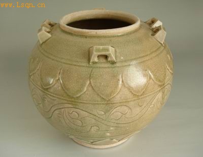 釉色青绿,施釉不到底,直口平唇,丰肩,腹鼓圆,平底。肩安桥形系六个。肩、腹分饰弦纹。腹中部刻划缠枝花卉。肩和颈刻划莲瓣纹,线条流畅,图案优美。