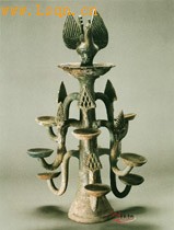 高65厘米、宽39厘米。 胎呈红色,遍施翠绿色厚釉。灯台造型的母体似为连理树。灯座呈喇叭口形,顶端托一圆盘,上承一支鼓翼的瑞鸟。中心柱上分三面伸出九支S形垂蔓。每蔓根部压一个三角形镂雕叶丛装饰,起遮光作用;顶端托一个可盛油盏的圆盘。穿插成三个层次,使造型富有节奏和韵律感。