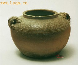高11.9厘米、口径10.3厘米、底径11.5厘米。 直口,斜肩处划两组弦纹,弦纹间填以流畅的水波纹,腹部缓缓下收,平底。双耳较粗,耳面刻划绳纹,这种有着绳纹的双耳以后随着时间的推移而简化成羽毛状纹饰贴塑于器物上。