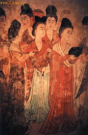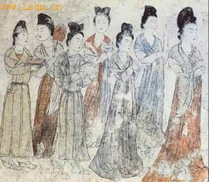 唐永泰公主墓的壁画上,有一幅梳高髻,露胸,肩披红帛,黄色窄袖短衫,绿色曳地长裙,腰系红色腰带的美少女壁画。这样的装扮,分明是T台秀上翩翩走来的当代模特。但那种雍容典雅飘逸脱俗之美,只能属于岁月深处盛隆无比的唐朝女子。那种“坐时衣带萦纤草,行即裙裾扫落梅”的自然背景,亦是植被稀少环境日益恶化的现代都市再也回不去的风景。
