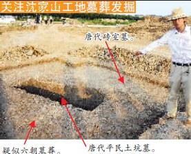 昨天,扬州城北沈家山瘦西湖西苑建筑工地古墓葬群考古工作又有新进展,考古人员又发现了六座古墓。据悉,截至目前,考古人员已挖掘清理了16座墓葬,其中,汉代墓葬4座、六朝时期墓葬6座、唐代墓葬6座,并出土了一些文物。令人称奇的是,位于工地东北角方向的一座墓地,被三个主人同时选中,出现了三墓同地的场景。