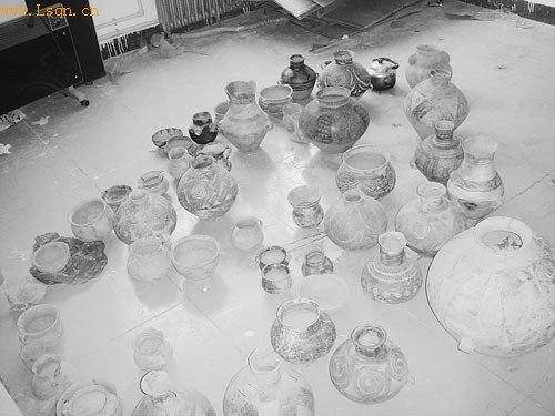 清韵斋字画店的里间里,放着许多彩陶,仅地上摆放的这些就有四十余件。刘畅摄