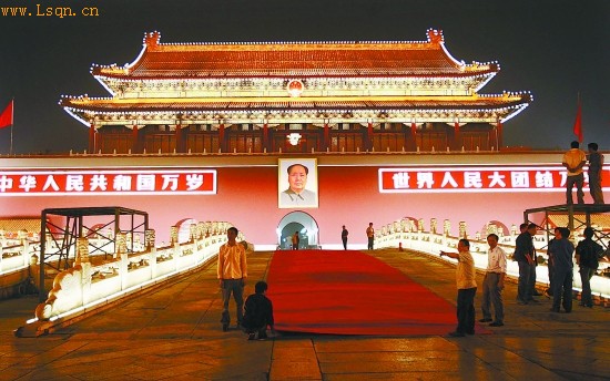 9月29日晚,工作人员在金水桥上铺设红地毯。当晚,参加国庆庆典的相关部门陆续进入天安门广场,为国庆庆典和联欢晚会进行场地布置和设备安装调试,天安门广场进入庆典前的最后准备阶段。 新华社记者 李紫恒摄
