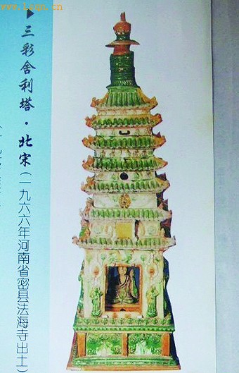上图为:1966年河南省密县法海寺塔基出土的宋三彩舍利塔,塔高98.5厘米,基边长30.5厘米。通体施红、绿、白三彩釉,光彩夺目。