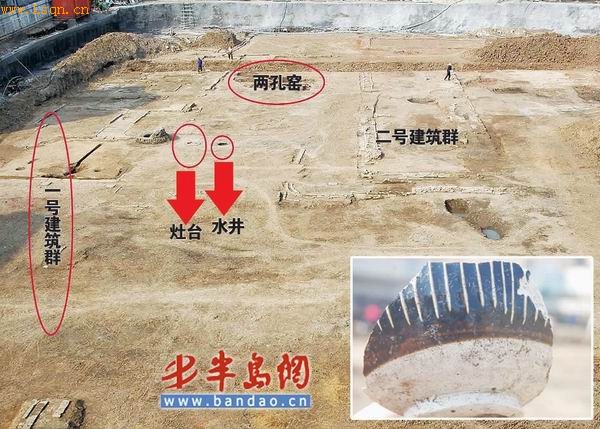 现场的考古发掘人员告诉记者,他们把现在已经发掘出来的两处主要建筑群中,西侧的建筑群称为1号建筑群,东侧的称为2号建筑群,而西侧的1号建筑群保存的相对完整一些,东侧的2号建筑群保存的要稍差一些,但是从这两处建筑群的整体形状看,建筑群的规格也都大致相同,建筑结构也都相似,中间的间隔为20米。两处建筑群紧密地连在一起,在中间形成了一个大院落,在中间院落的空地上还出现了两个窑口,3个灶台口和一个水井。