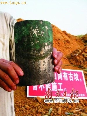 本报讯(记者/欧阳少伟)正在施工的飞来湖防灾减灾工程施工人员近日在清新黄坑芋头岗施工过程中,发现了一处古坟,并在准备进行推平作业时从古坟土堆中掘出了一块青铜墓碑和陶器若干。据史料记载,芋头岗古墓曾葬有明朝将军白廷用,芋头岗的施工因此被暂时叫停。