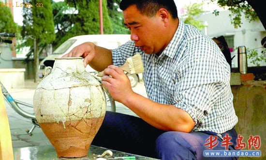工作人员正在修复装酒的四耳瓷壶。