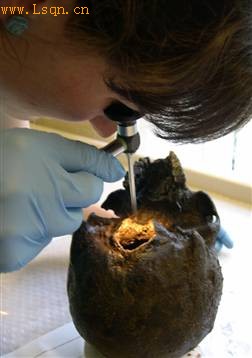 在清理一所学校在一座史前农场扩建期间出土的一个古人头骨时,库比特感觉到头骨里有东西在晃动。经过仔细检查她发现了一些奇特的黄色物质,由此她意外发现了头骨中残存的脑组织。这个头骨是在一个泥坑单独发现的。研究人员认为,其主人当年很可能充当了某次祭祀活动的牺牲品。在这张照片中,库比特正使用内诊镜检查出土头骨。