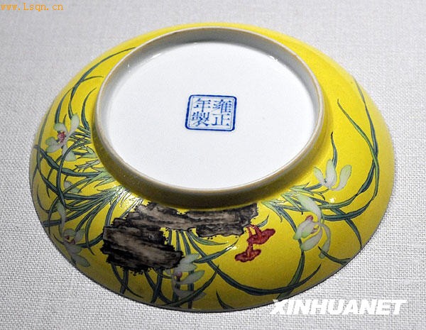 这是10月6日在台北拍摄的清雍正瓷胎画珐琅黄地芝兰图盘。