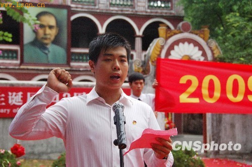11月12日,为纪念孙中山先生诞辰143周年,广东中山市在翠亨村孙中山故居隆重举行2009“孙中山文化周”启动仪式,当天一群青年学生在孙中山故居前举行成人宣誓。中新社发梁永强 摄