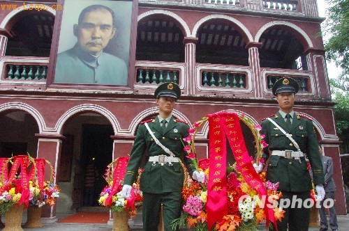 11月12日,为纪念孙中山先生诞辰143周年,广东中山市在翠亨村孙中山故居隆重举行“2009孙中山文化周”启动仪式,文化周以“扬中山精神,塑文化品牌”为主题,内容涵盖纪念活动、文化活动、旅游活动三大系列50多个异彩纷呈的项目。图为启动仪式上社会各界在孙中山故居前敬献花篮。中新社发 梁永强 摄