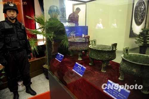 范季融、胡盈莹夫妇向中国捐赠的部分青铜器。中新社发 廖攀/摄