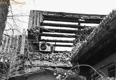 从寺庙西北侧的后院向里看,偏殿木质结构的椽子已经被烧得焦黑
